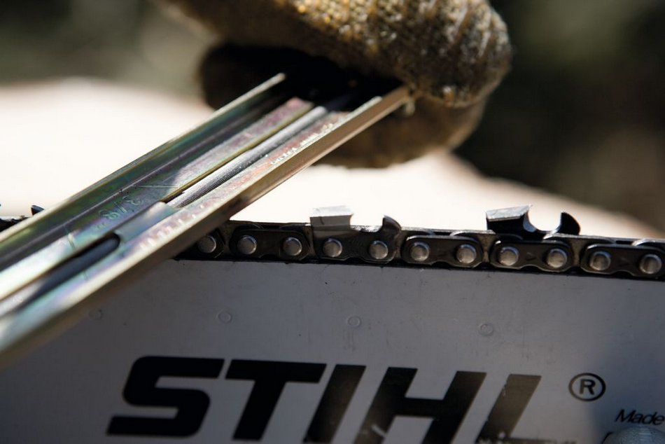При нарушении данных рекомендаций вы рискуете увеличить нагрузка на бензопилу, что в свою очередь приведет к повышенному износу её деталей. Если цепь давно не точилась или сильно заехала в твердый материал (к примеру, гравий), лучше воспользоваться ручным или электрическим станком. Принцип работы данного оборудования совершенно прост. Сначала определяется самый маленький зуб цепи, под который впоследствии подгоняются все остальные. Главное в работе с таким станком — четко настроить все необходимые параметры. На заточку одного зубца требуется 2-3 движения станка, после чего, не меняя настроек, нужно повторить то же самое для следующего зубца. Электрический станок довольно прост в использовании и позволяет максимально точно заточить бензопилу. Порядок работы с ним включает следующие этапы: 1. Ослабление винта, определяющего зажим цепи. 2. Установку цепи в направляющий паз (звенья должны быть направлены к заточному камню). 3. Выставление угла для заточки (чаще всего он равен 30 градусам). Далее начинается сам процесс заточки. И здесь можно выбрать любой из удобных способов: затачивать резцы по очереди, постоянно меняя полярность или затачивать однополярные резцы (через один), что позволит сначала наточить левосторонние зубцы, а потом – все правосторонние. Если же нет возможности использовать станок для заточки цепи, можно воспользоваться специальным набором инструментов. Набор инструментов обычно включает: круглый напильник, плоский напильник, державка для круглого напильника и крючок, предназначенный для удаления опилок. Имея эти приспособления и некоторые навыки, вы сможете произвести грамотную заточку несильно затупившейся пилы. Особое внимание уделяется применению державки. Она обеспечивает правильную высоту прилегания напильника к зубцу. Благодаря её специальным линиям можно без проблем установить инструмент относительно цепи пилы. Державка ставится на зуб, который собираются затачивать, при этом пластина должна упираться в его верхний край и ограничитель глубины, а напильник должен находиться под режущей кромкой. Качественная заточка цепи подобным методом требует соблюдения важного условия: напильник должен выступать над спинкой зуба примерно на 20% от своего диаметра. Круглые напильники нужны для затачивания режущего зубца. В зависимости от шага бензопилы выбирают напильники диаметром от 3 до 6 мм. Плоские напильники шириной 4-12 мм нужны для снятия контрольного зубца. При заточке следует придерживаться ряда основных правил: